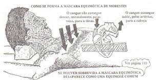 Por sua vez, na MÁSCARA EQUIMÓTICA DE MORESTIN ou CIANOSE CÉRVICO-FACIAL há o extravasamento de sangue permanecendo nos tecidos do corpo, infiltrado nas malhas tissulares.