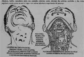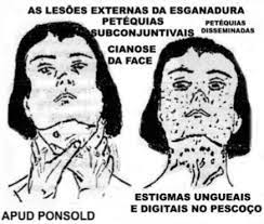 Essa coloração azulada decorre da ausência de oxigênio no sangue. Por conta da pressão nesse local (hipertensão veno-capilar), ocorre extravasamento sanguíneo. Com isso formam-se inúmeras petéquias por toda a extensão da face, formando uma MÁSCARA, por toda a região da face, do pescoço e do terço superior do tórax.